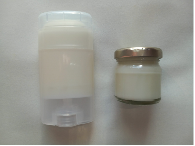 - Huile de coco, bicarbonate de soude, huiles essentielles de sauge et géranium rosa